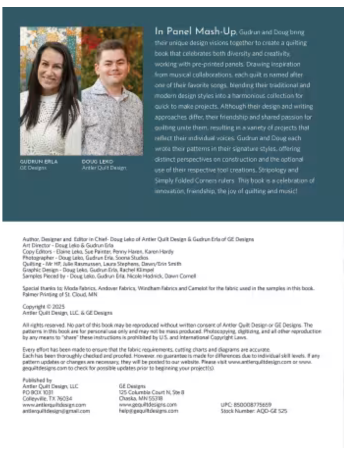 Panel Mash-Up is a brand-new book packed with creative ways to turn fabric panels into dynamic quilts. Co-authored by quilting besties; Gudrun Erla of GE Designs and Doug Leko of Antler Quilt Design, this book features quilt patterns that are fresh, fun, and easy to personalize.