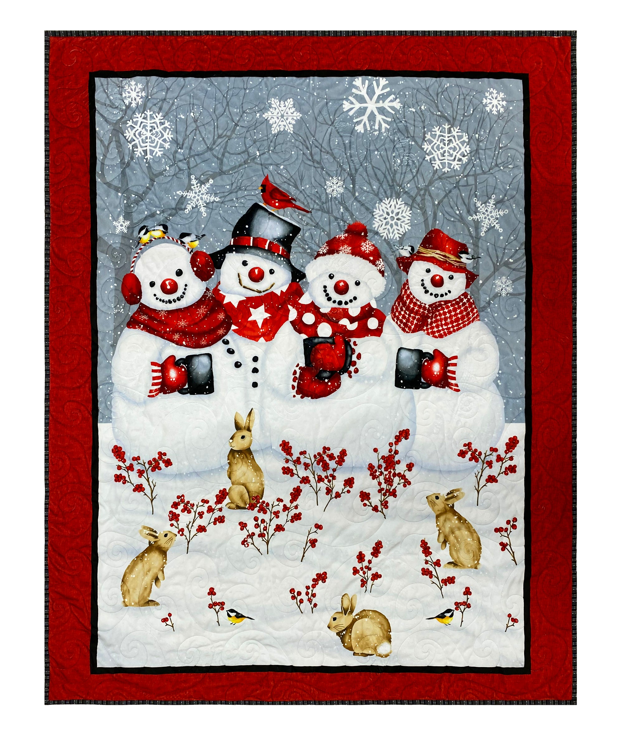 Gather 'round for cozy winter vibes! This charming minky panel features a delightful scene of cheerful snowmen huddled together in a snowy woodland setting, each clutching a steaming mug of their favorite hot drink. Perfect for quilters and sewers who love whimsical seasonal designs, this soft minky fabric brings warmth.
