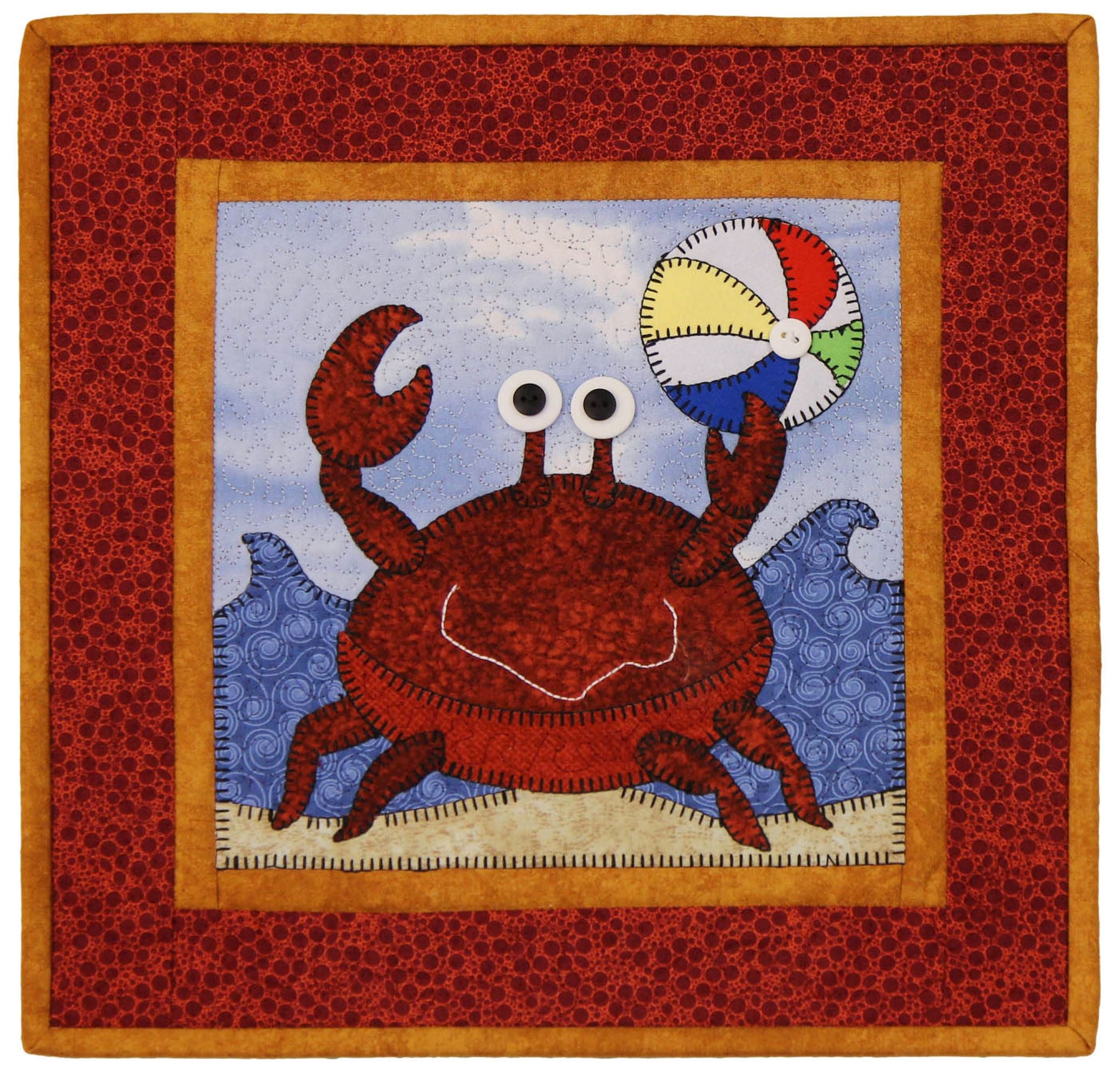 This is one in a series of small quilts designed to be changed each month. August Beach by Wooden Bear is a kit for 12" x 12" wall quilt with appliqued crab and seaside. Looks great on a wall or on the special stand, 12 x 14, made just to fit this size.