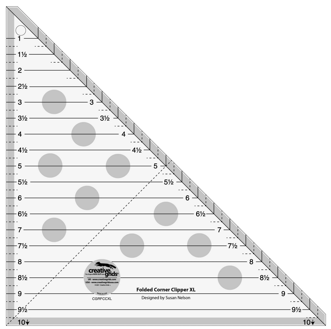 The extra-large Folded Corner Clipper designed by Susan Nelson for Creative Grids® will help you make folded corners quickly and accurately. Perfect for working with squares up to 10in.