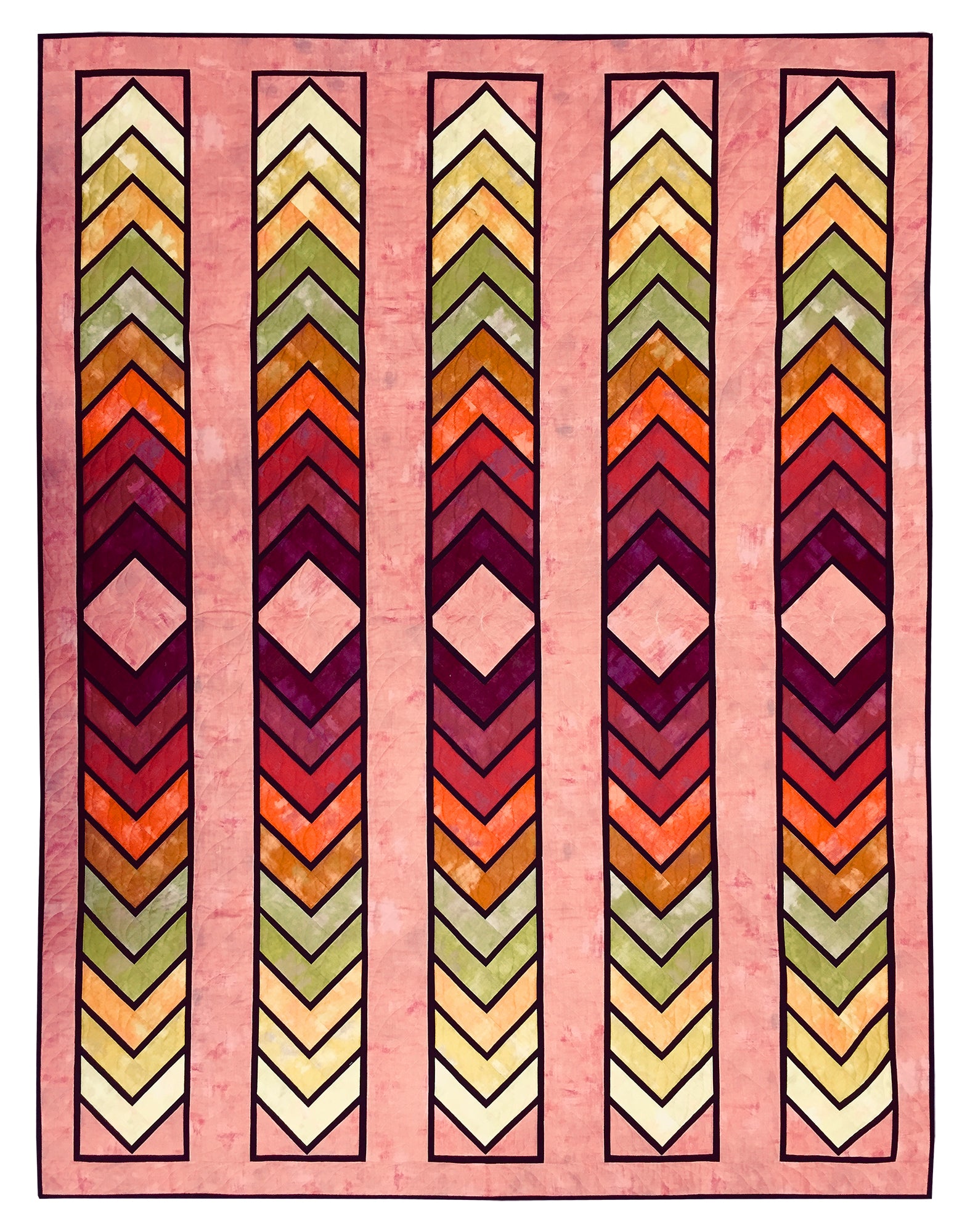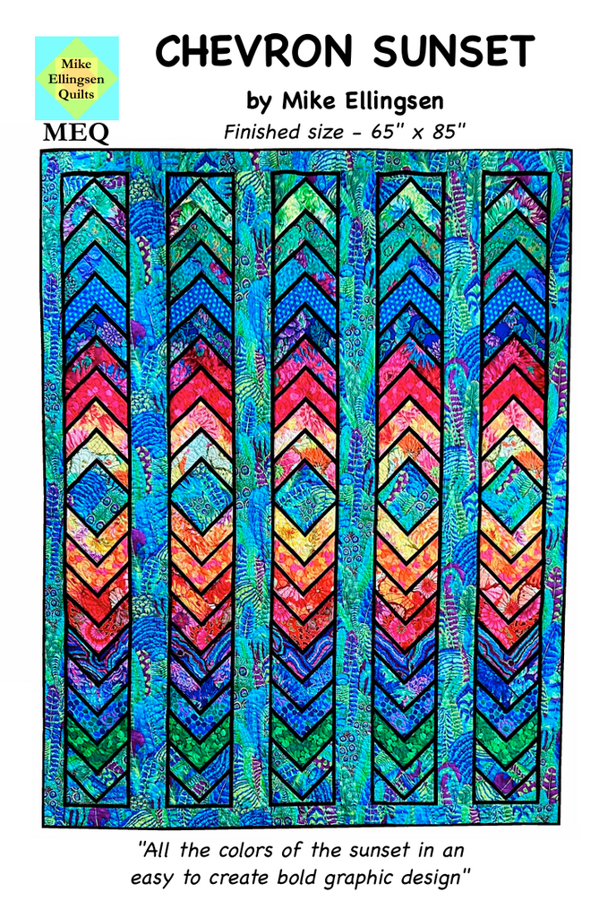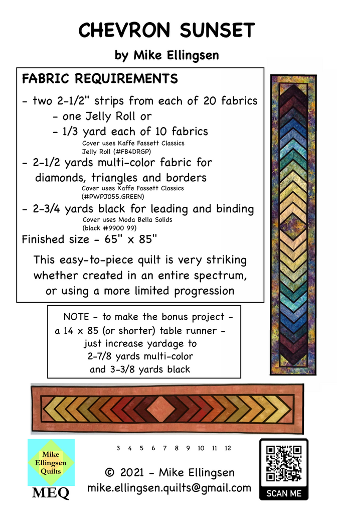 Mike’s Chevron Bed Runner pattern was popular - in fact, we sold it until we couldn't get the fabric any more! Students had asked him for a larger version - and this past year gave him a little extra time - so here you go! This 65 x 85 quilt is made from 2 Junior Jelly Rolls, border fabric, and black - and if you add a bit more of those last two fabrics, there is enough fabric from the Jelly Rolls to make a bonus table runner - up to 85 inches long! This quilt is easier than it looks - and it goes together in a snap!