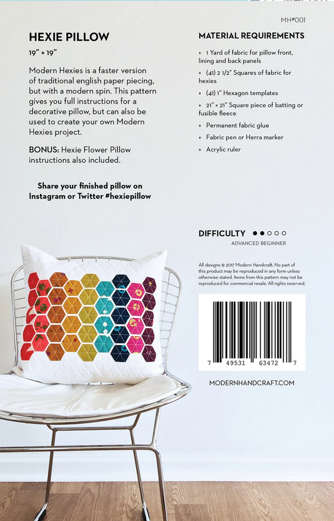 Modern Hexies is a faster version of traditional English paper piecing, but with a modern spin. This pattern gives you full instructions for a decorative pillow, but can also be used to create your own Modern Hexies project. Bonus Hexie Flower Pillow instructions are also included.