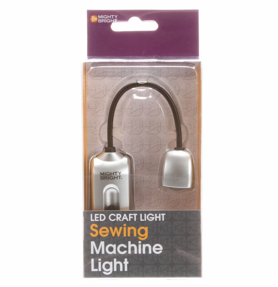 The Mighty Bright Sewing Machine Light is versatile, energy-efficient, and cool-to-the-touch. It comes with 2 mounting bases and can be used as a sewing machine light or anywhere else you need it. Its bright white, energy-efficient LED is rated for 100,000 hours and is powered by 1 AAA battery (included) and lasts 25 hours. 10 Lumens.